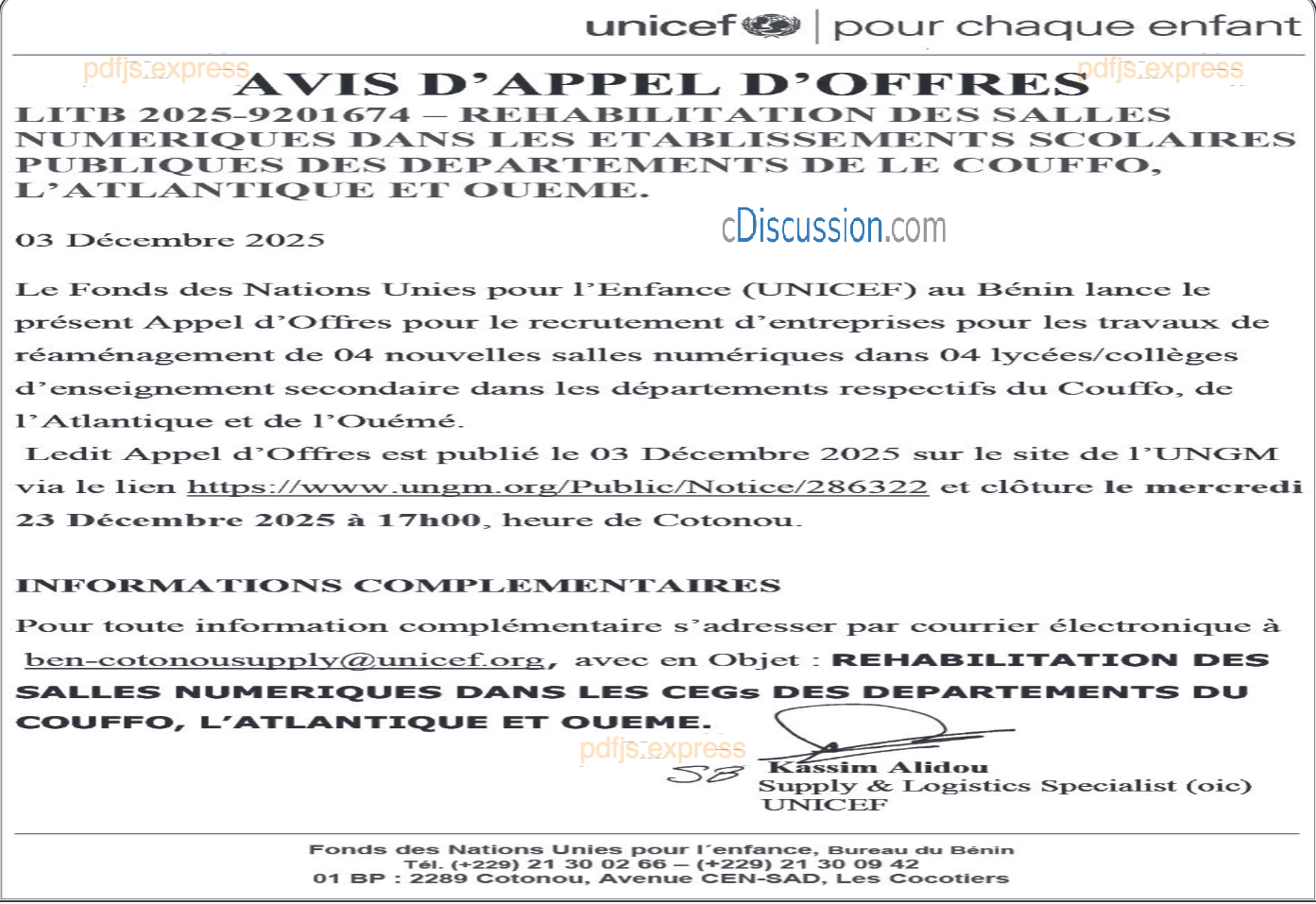 Avis d'appel d'offres LITB 2025-2026 relatif à la réhabilitation des salles numériques dans les établissements scolaires publiques des départements de COUFFO, l'ATLANTIQUE et de OUEME
