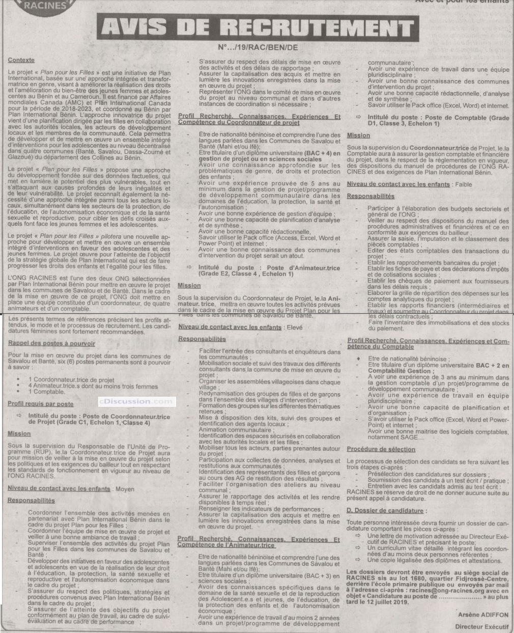 L'ONG RACINES recrute pour les postes ci-dessous :