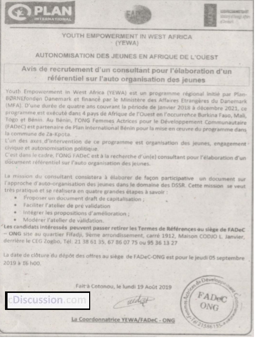 Avis de recrutement d'un Consultant pour l'élaboration d'un référentiel sur l'auto organisation des jeunes