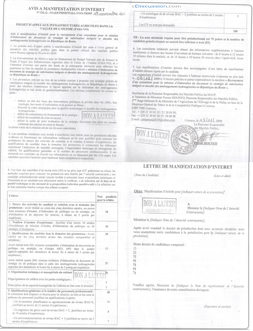 Avis à manifestation d'intérêt pour le recrutement d'un Consultant pour la mission d’élaboration du document de stratégie de valorisation intégrée et durable des aménagements hydroagricoles en République du Bénin