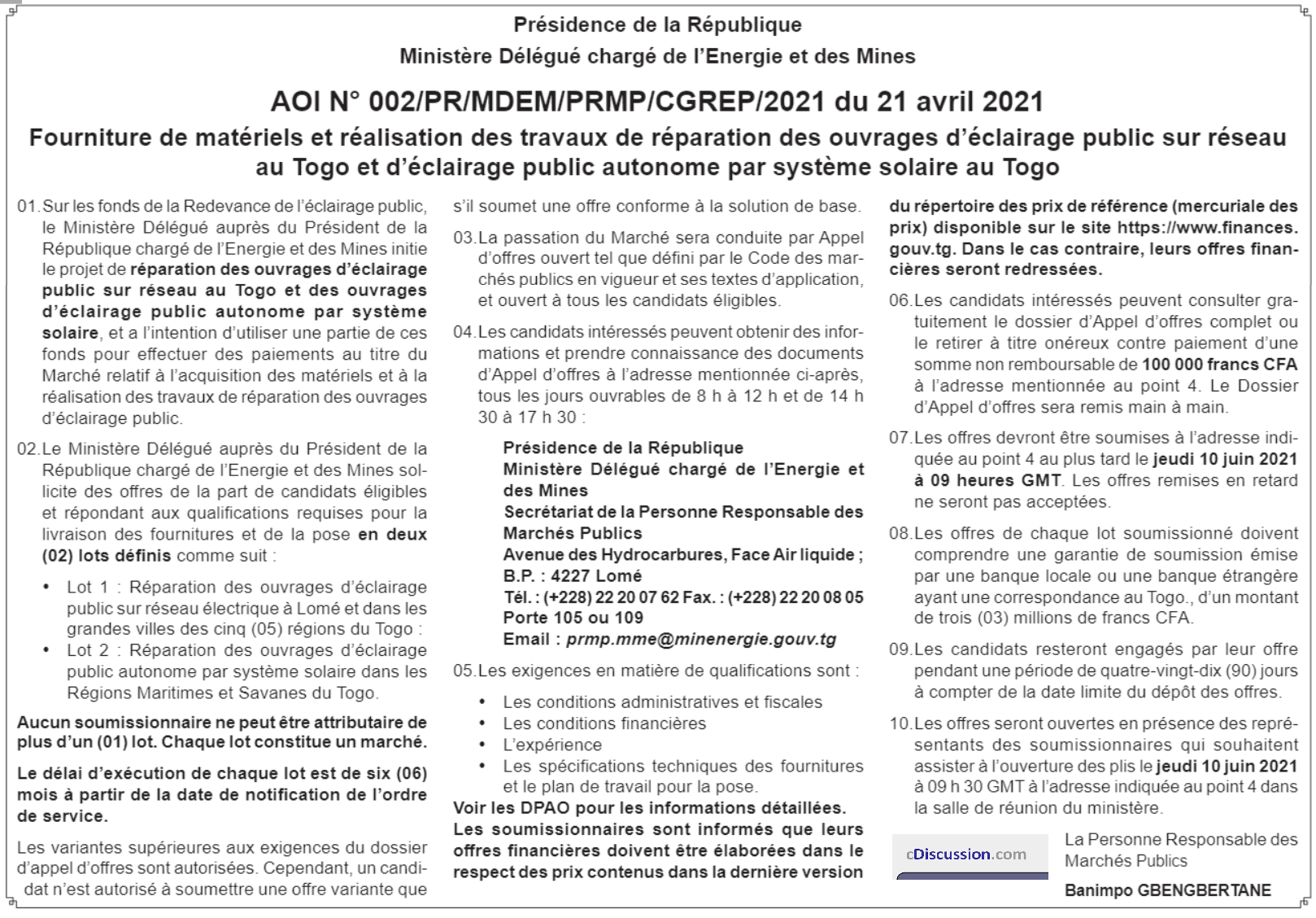 Appel d'Offre pour la fourniture de matériels et réalisation des travaux de réparation des ouvrages d'éclairage public sur réseau au Togo et d'éclairage public autonome par système scolaire au Togo