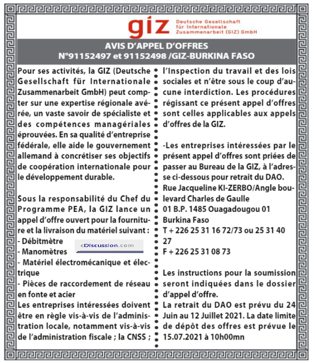 La GIZ lance un appel d'offre ouvert pour la fourniture et la livraison du matériel