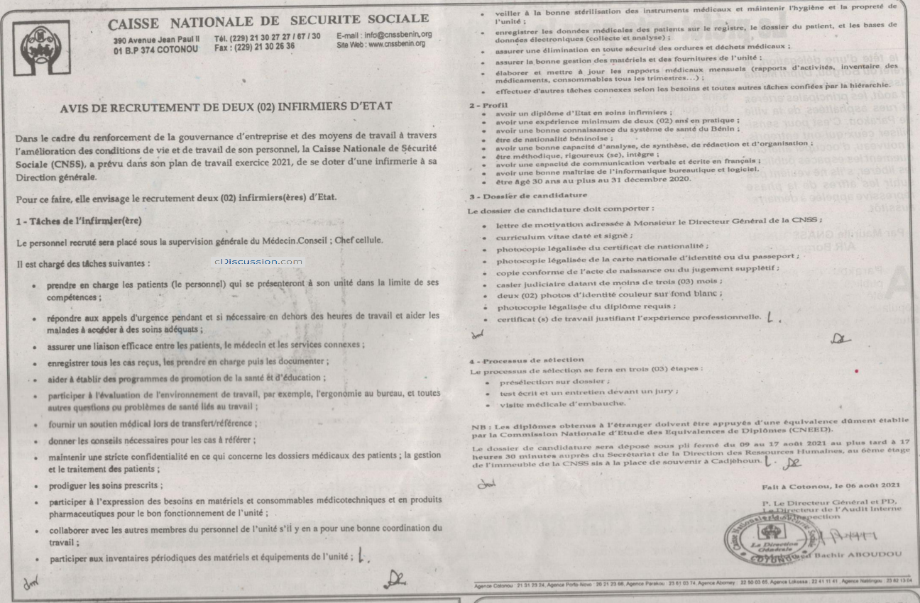 (02) Infirmiers d'Etat "être de nationalité béninoise"