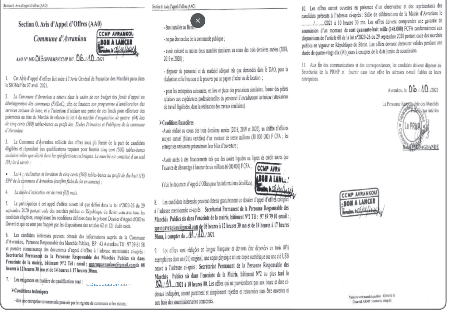 Avis d'Appel d'Offres (AA0) pour l'acquisition de quatre (04) lots de cinq (500) tables-blancs au profit des Ecoles Primaires et Publiques de la commune d'Avrankou