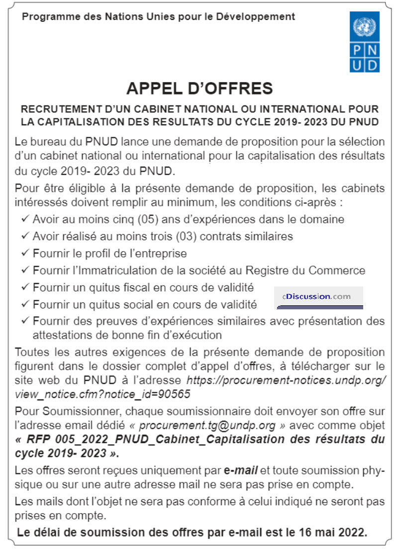 Appel d'Offres pour le recrutement d'un Cabinet National ou International pour la capitalisation des résultats du cycle 2019-2023 du PNUD