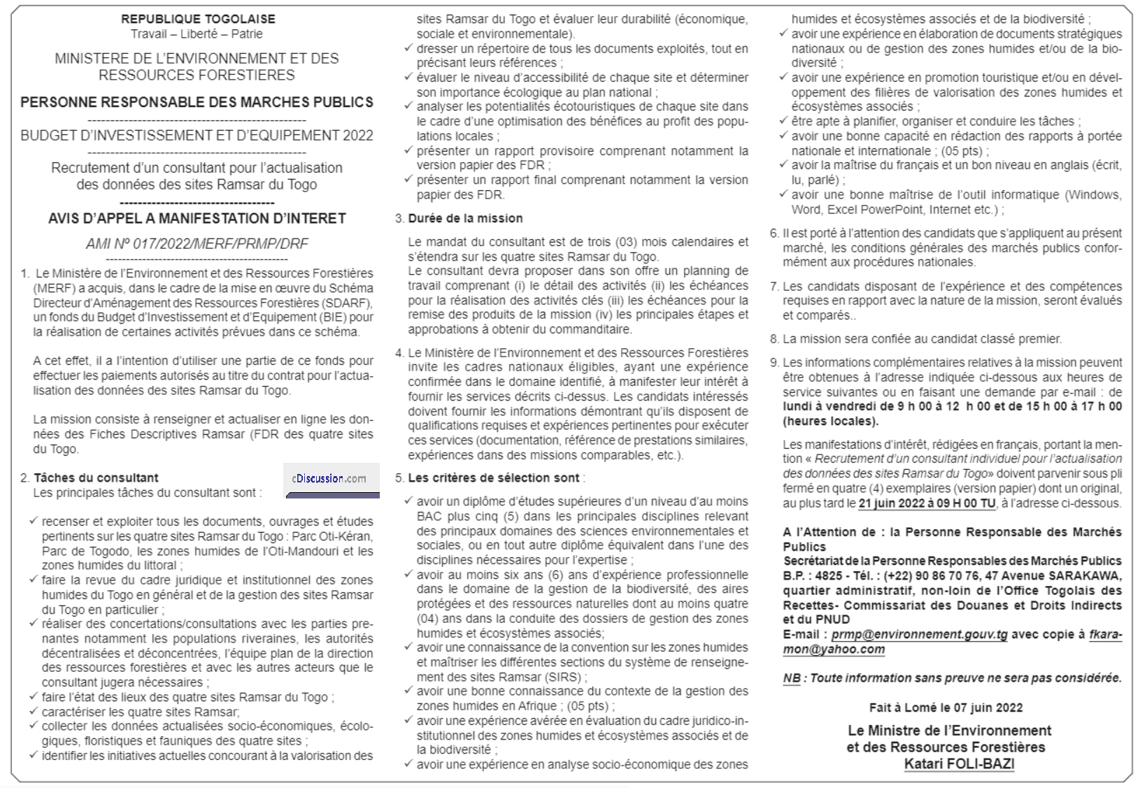 Avis d'Appel à manifestation d'intérêt pour le recrutement d'un Consultant pour actualisation des données des sites Ramsar du Togo