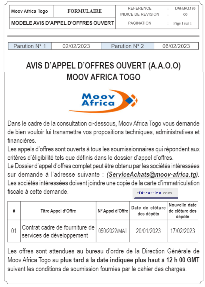 Avis d'Appel d'Offres Ouvert du contrat cadre de fourniture de services de développement