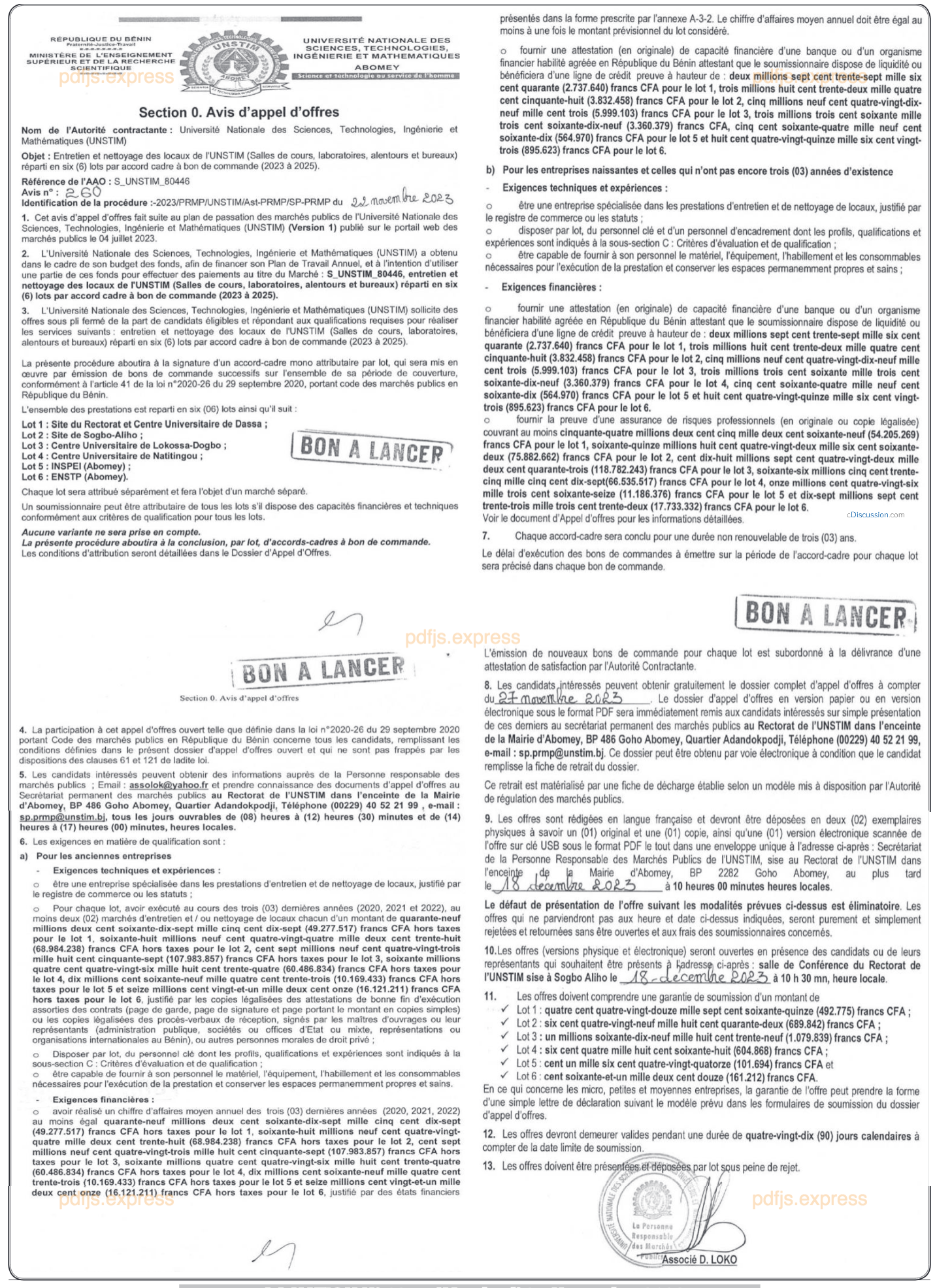 Avis d'appel d'offres pour l'entretien et nettoyage des locaux de l'UNSTIM (salle de cours, laboratoires, alentours et bureaux) réparti en six (6) lots par accord cadre à bon commande (2023 à 2025)