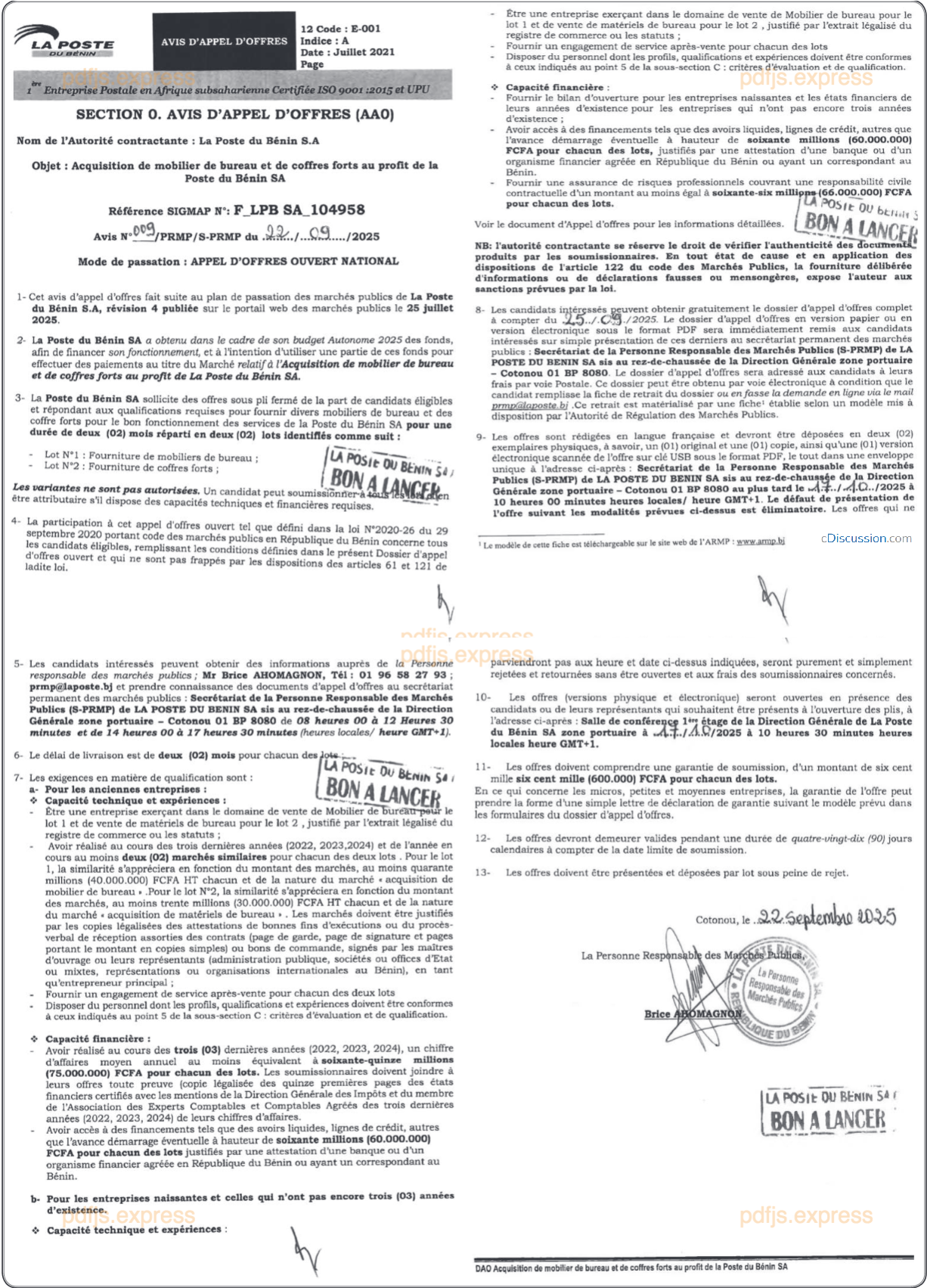 Avis d'appel d'offres pour l'acquisition de mobiliers de bureau et de coffres forts au profit de la Poste du Bénin SA