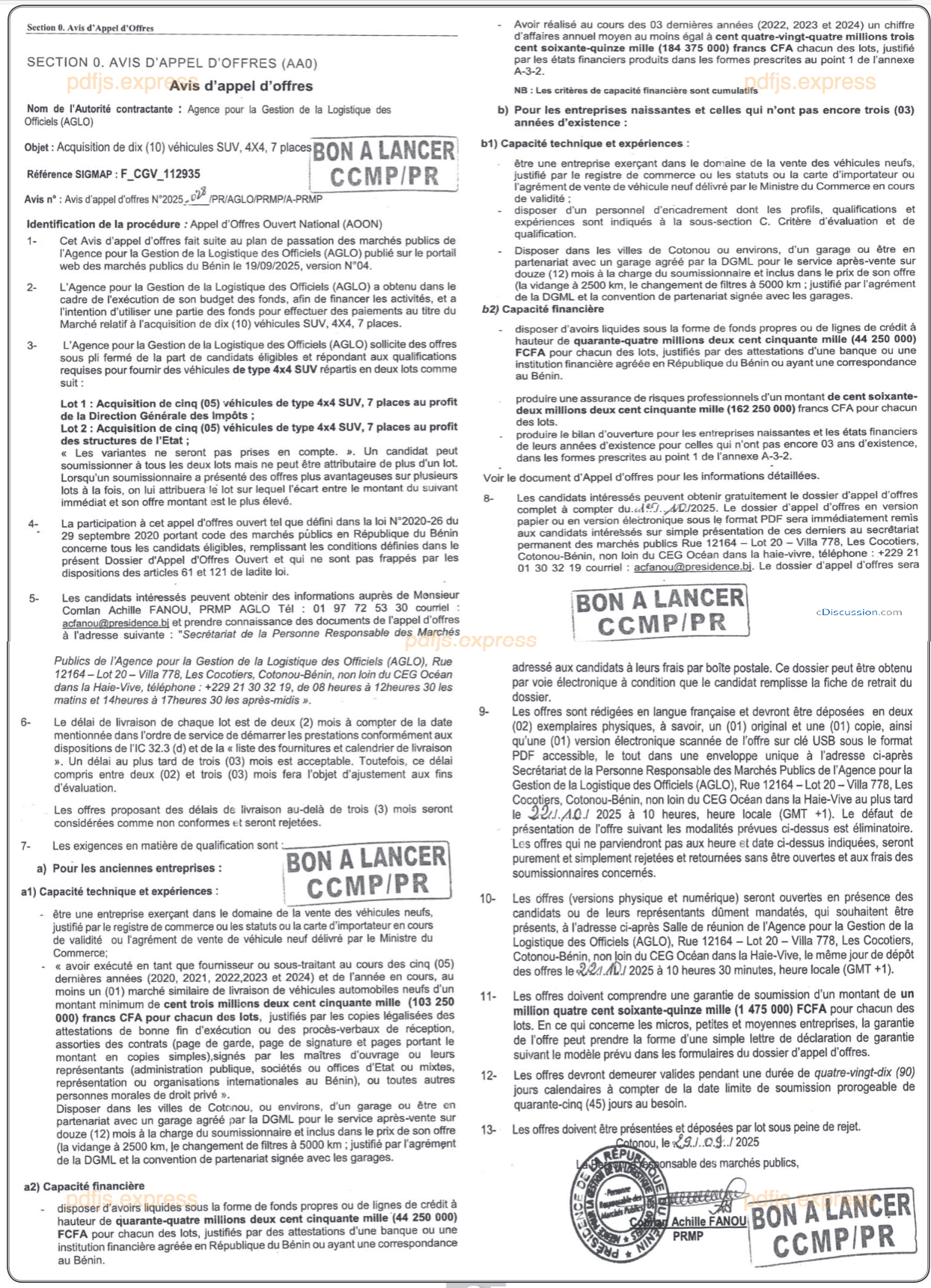 Avis d'appel d'offres relatif à l'acquisition de dix (10) véhicules SUV, 4x4, 7 places