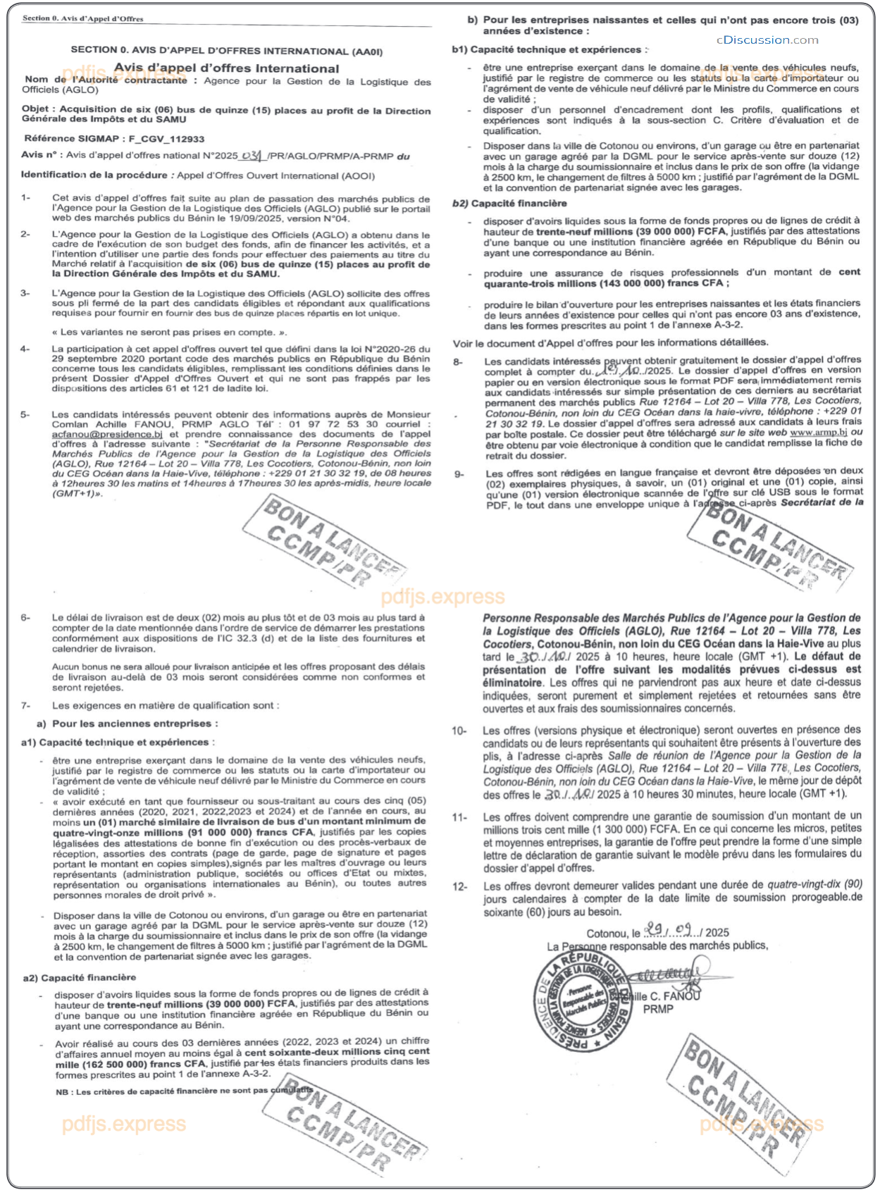 Avis d'appel d'offres international relatif à l'acquisition de six (06) bus de quinze (15) places au profit de la Direction Générale des Impôts et du SAMU