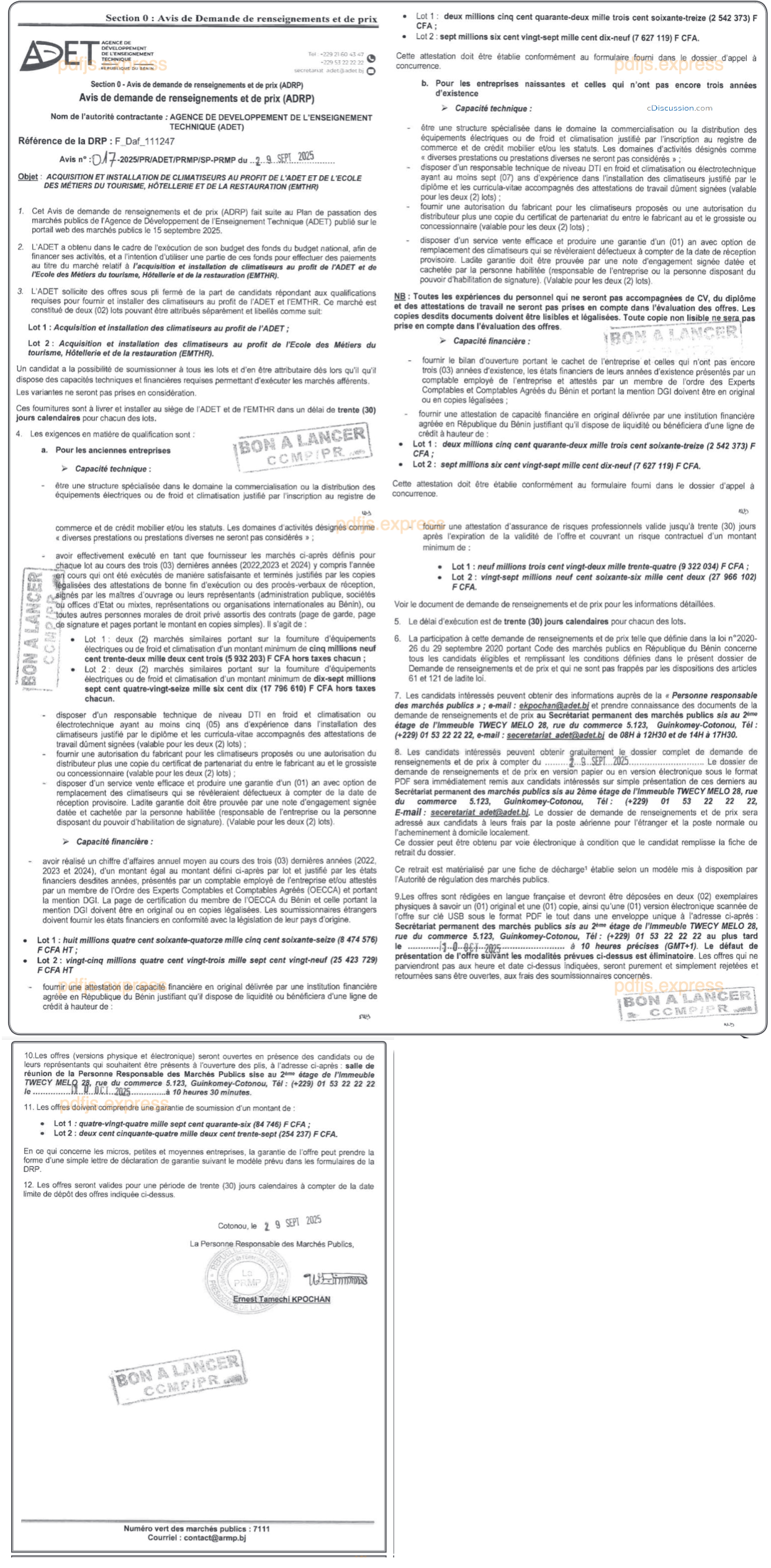 Avis de demande de renseignements et de prix relatif à l'acquisition et installation de climatiseurs au profit de l'ADET et de l'Ecole des Métiers du tourisme, Hôtellerie et de la Restauration (EMTHR)