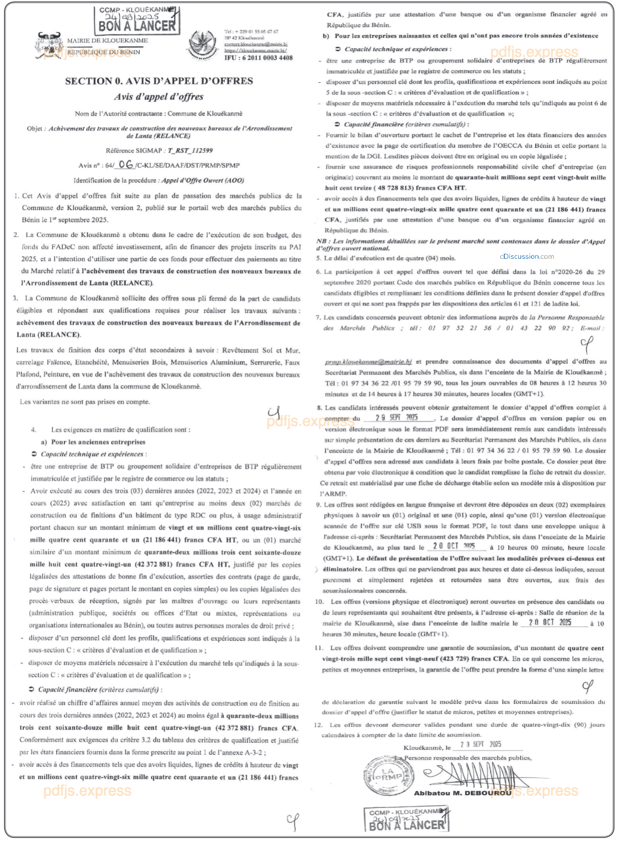 Avis d'appel d'offres relatif à l'achèvement des travaux de construction des nouveaux bureaux de l'Arrondissement de Lanta (Relance)