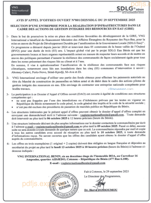 Sélection d'un Entreprise pour la réalisation d'infrastructure dans le cadre des actions de gestion intégrée des ressources en Eau (GIRE)