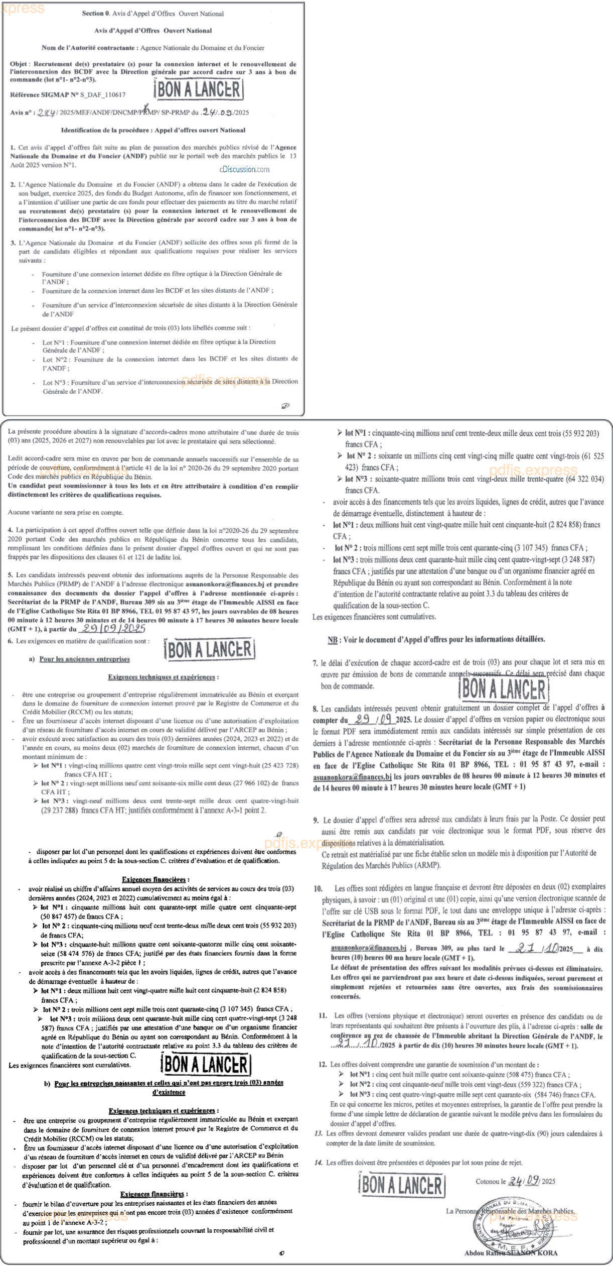 Recrutement de(s) Prestataire(s) pour la connexion internet et le renouvellement de l'interconnexion des BCDF avec la Direction générale par accord cadre sur 3 ans à bon de commande (lot n°1-n°2-n°3)
