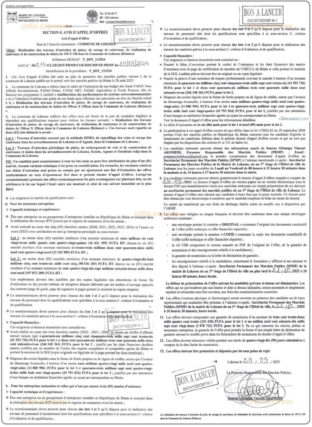 Avis d'appel d'offres relatif à la Réalisation de pistes, de curage, de caniveaux, de réalisation de caniveaux et de construction de dalots de 150 X 150 dans la Commune de Lokossa