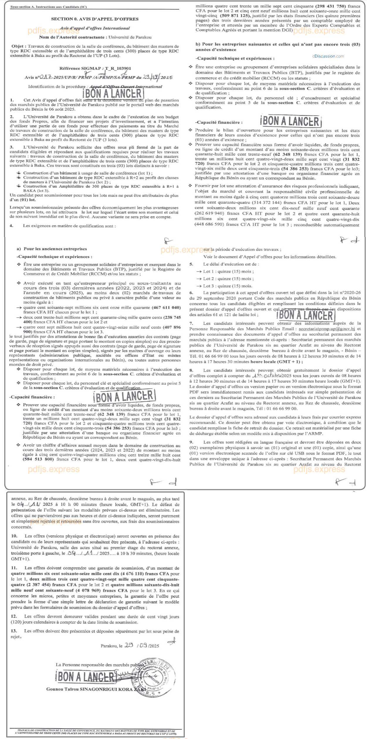 Avis d'appel d'offres pour les travaux de construction de la salle de conférence, du bâtiment des masters de type RDC extensible et de l'amphithéâtre de trois cent (300) places de type RDC extensible à Baka au profit du Rectorat de l'UP (3 Lots)