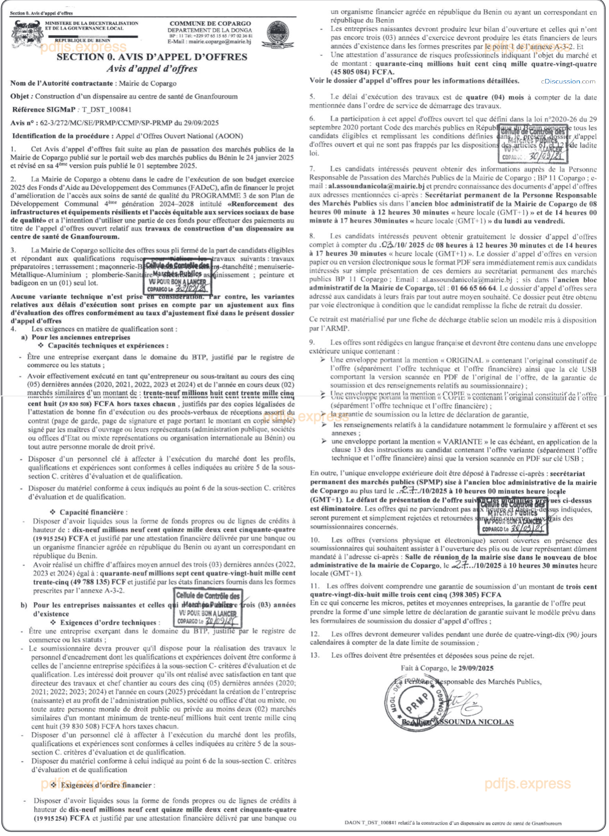 Avis d'appel d'offres pour la construction d'un dispensaire au centre de santé de Gnanfouroum