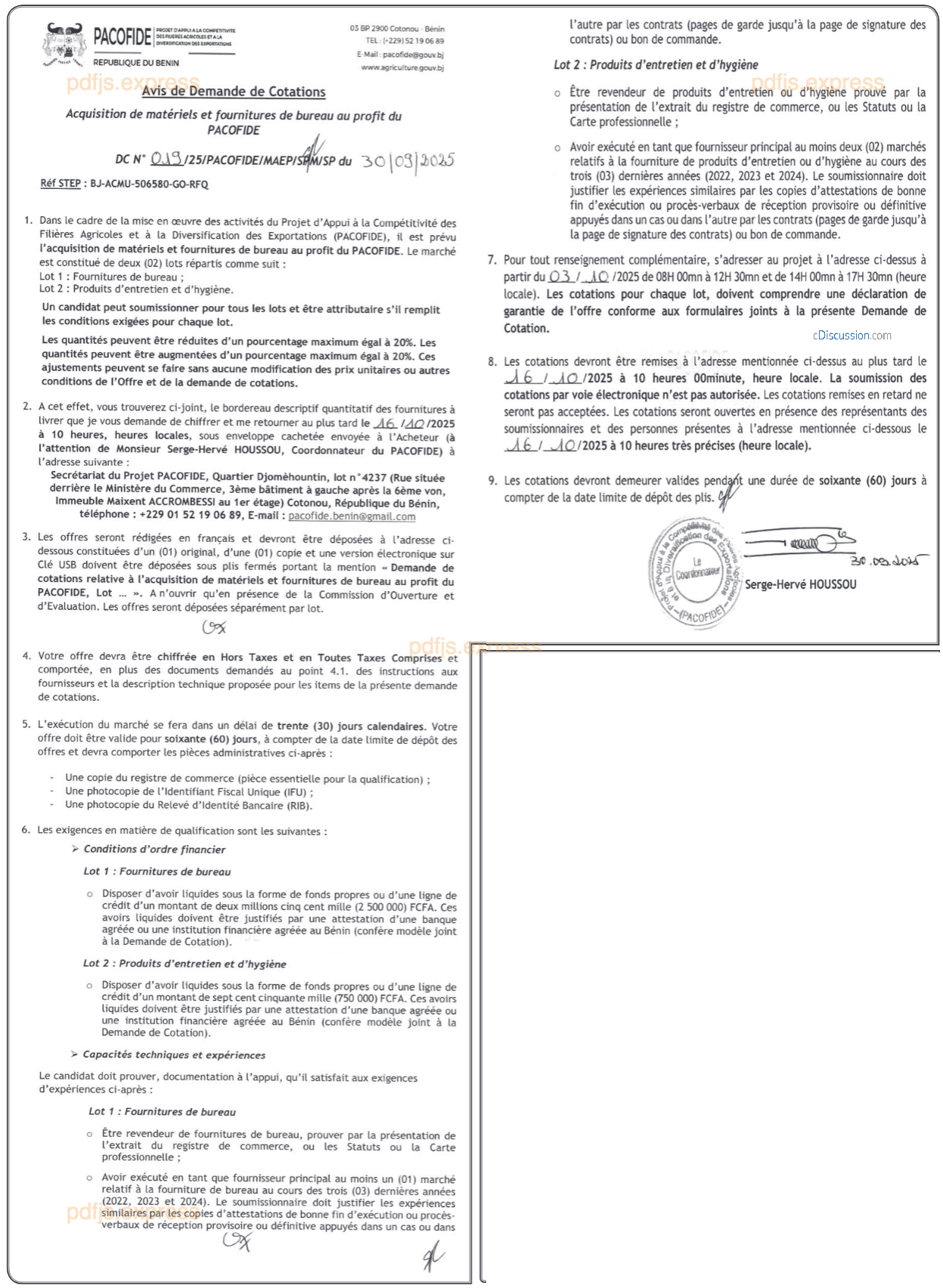 Avis de demande de cotation pour l'acquisition de matériel et fournitures de bureau au profit du PACOFIDE