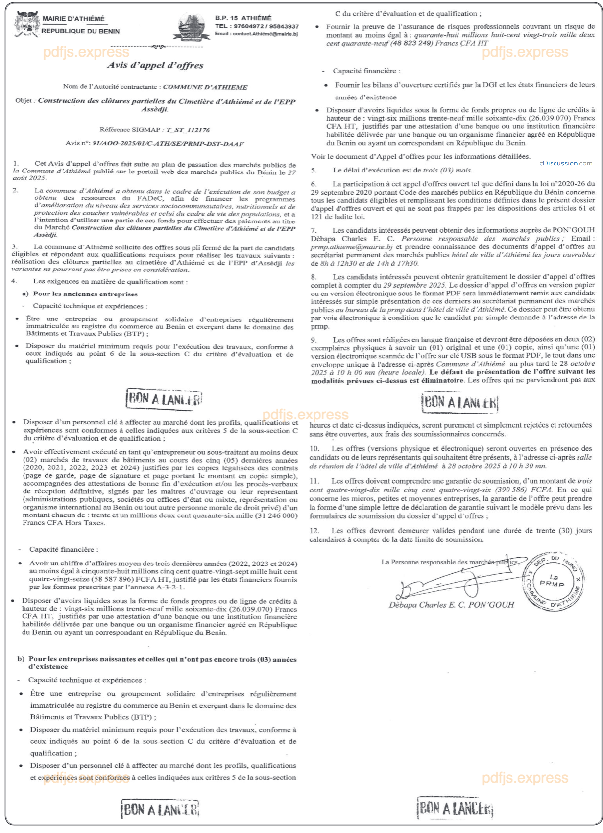 Avis d'appel d'offres pour la construction des clôtures partielles du Cimetières d'Athiémé et de l'EPP Assèdji