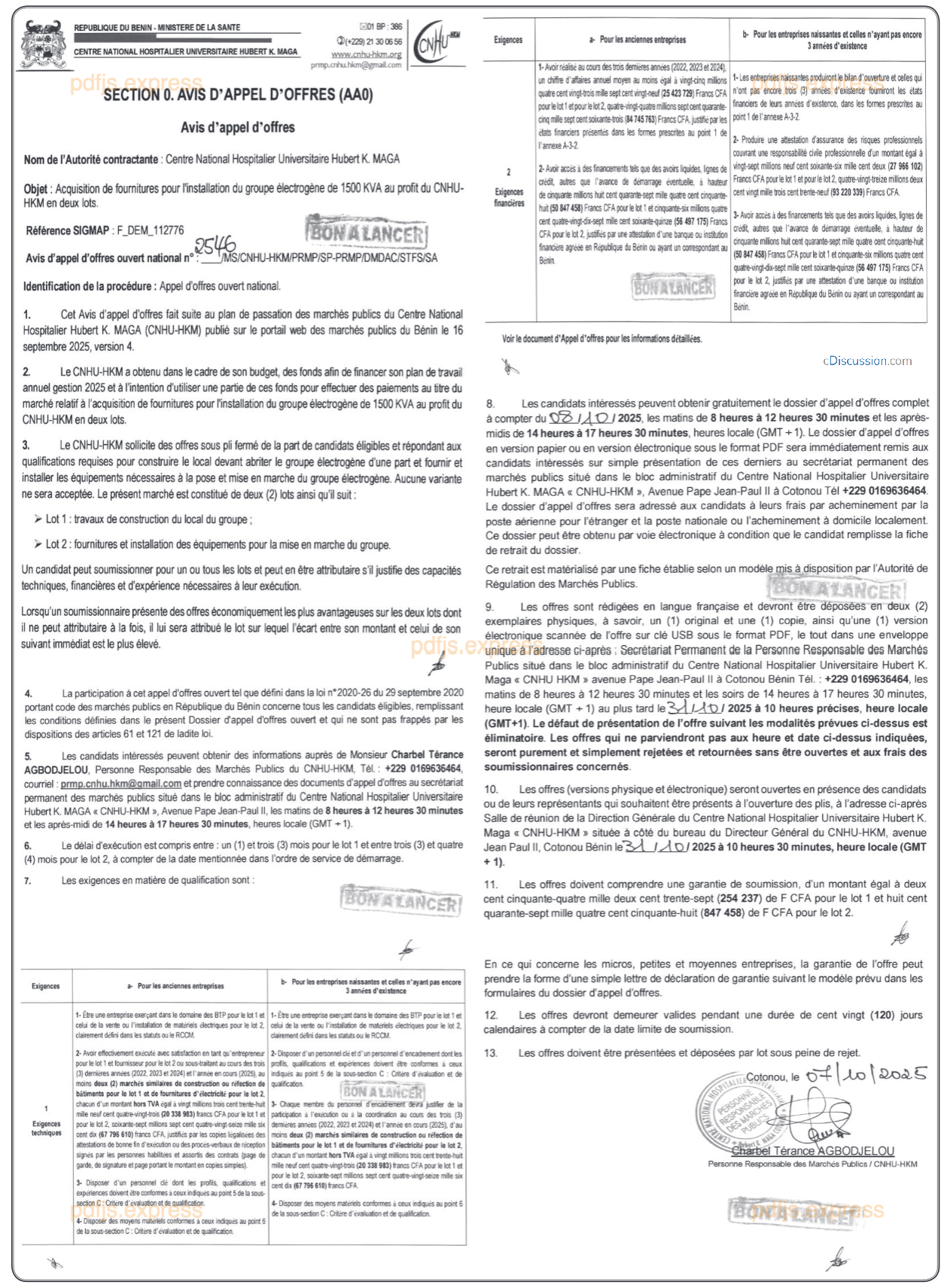 Avis d'appel d'offres relatif à l'acquisition de fournitures pour l'installation du groupe électrogène de 1500 KVA au profit du CNHU-HKM en deux lots
