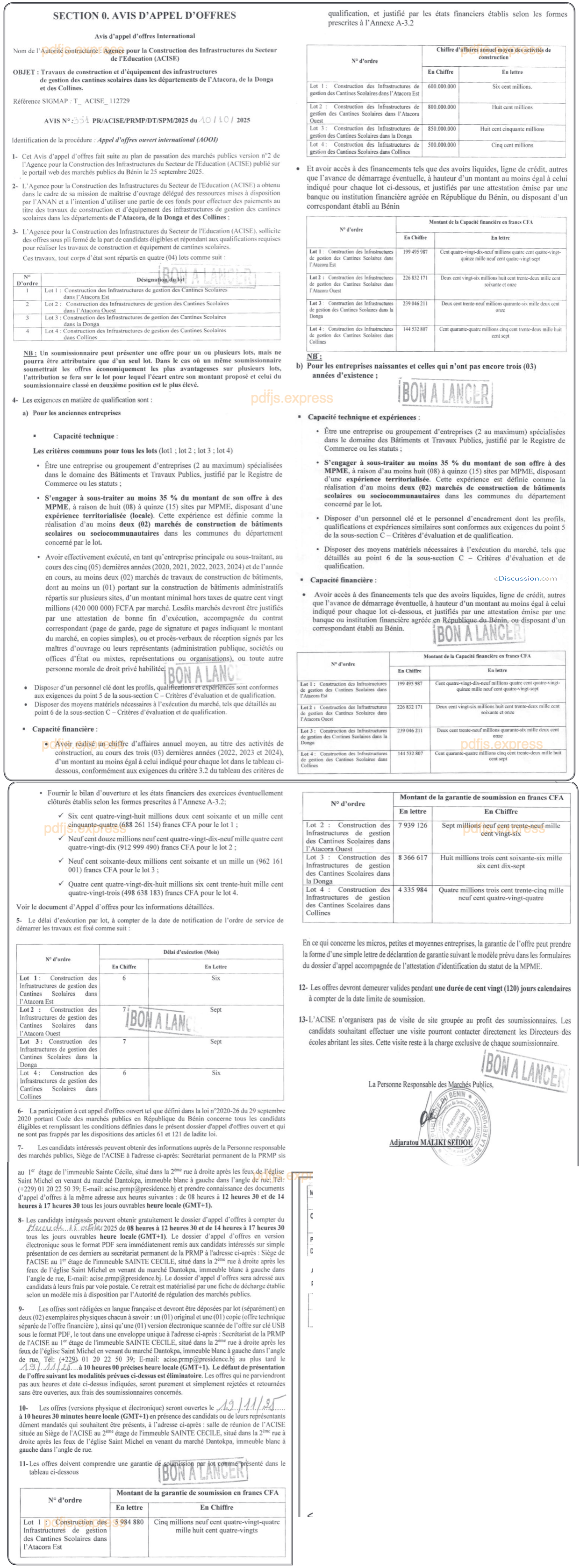 Avis d'appel d'offres pour les travaux de construction et d'équipement des infrastructures de gestion des cantines scolaires dans les départements de l'Atacora, de la Donga et des Collines