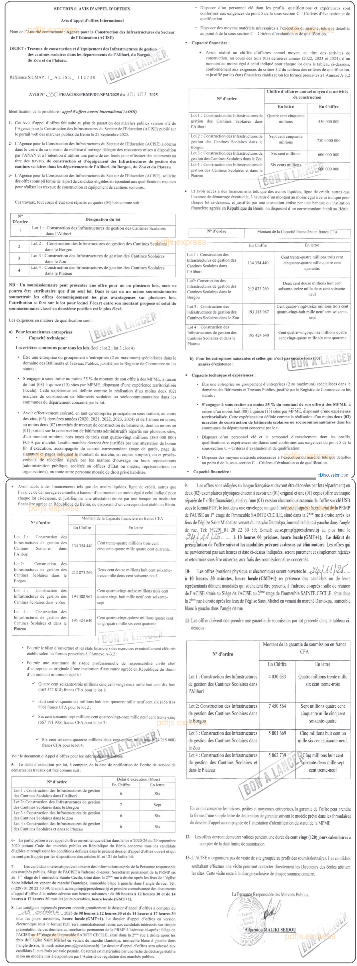 Avis d'appel d'offres international pour les travaux de construction et d'équipement des infrastructures de gestion des cantines scolaires dans les départements de l'Alibori, du Borgou, du Zou et du Plateau