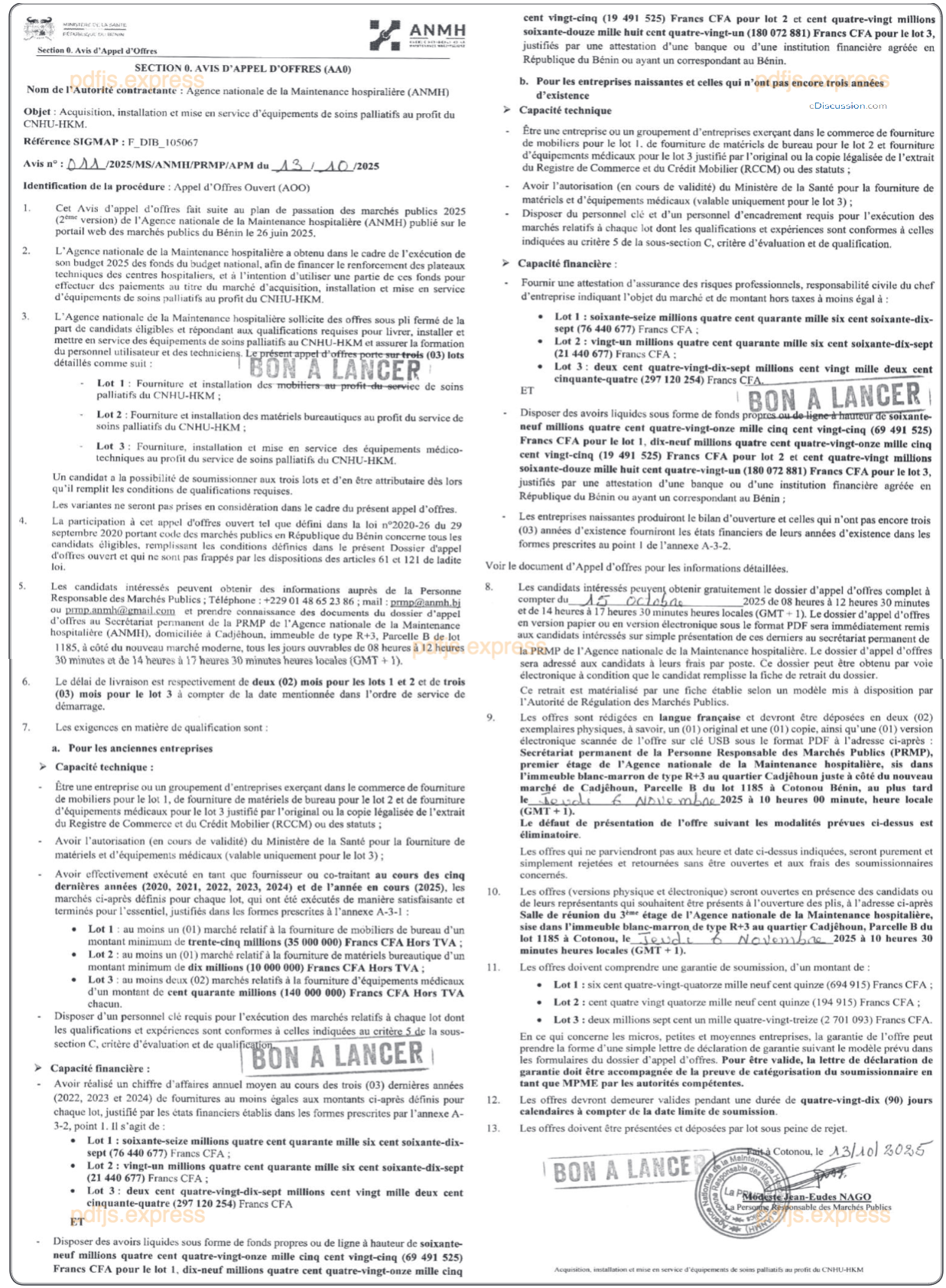 Avis d'appel d'offres pour l'acquisition, installation et mise en service d'équipements de soins palliatifs au profit du CNHU-IKM