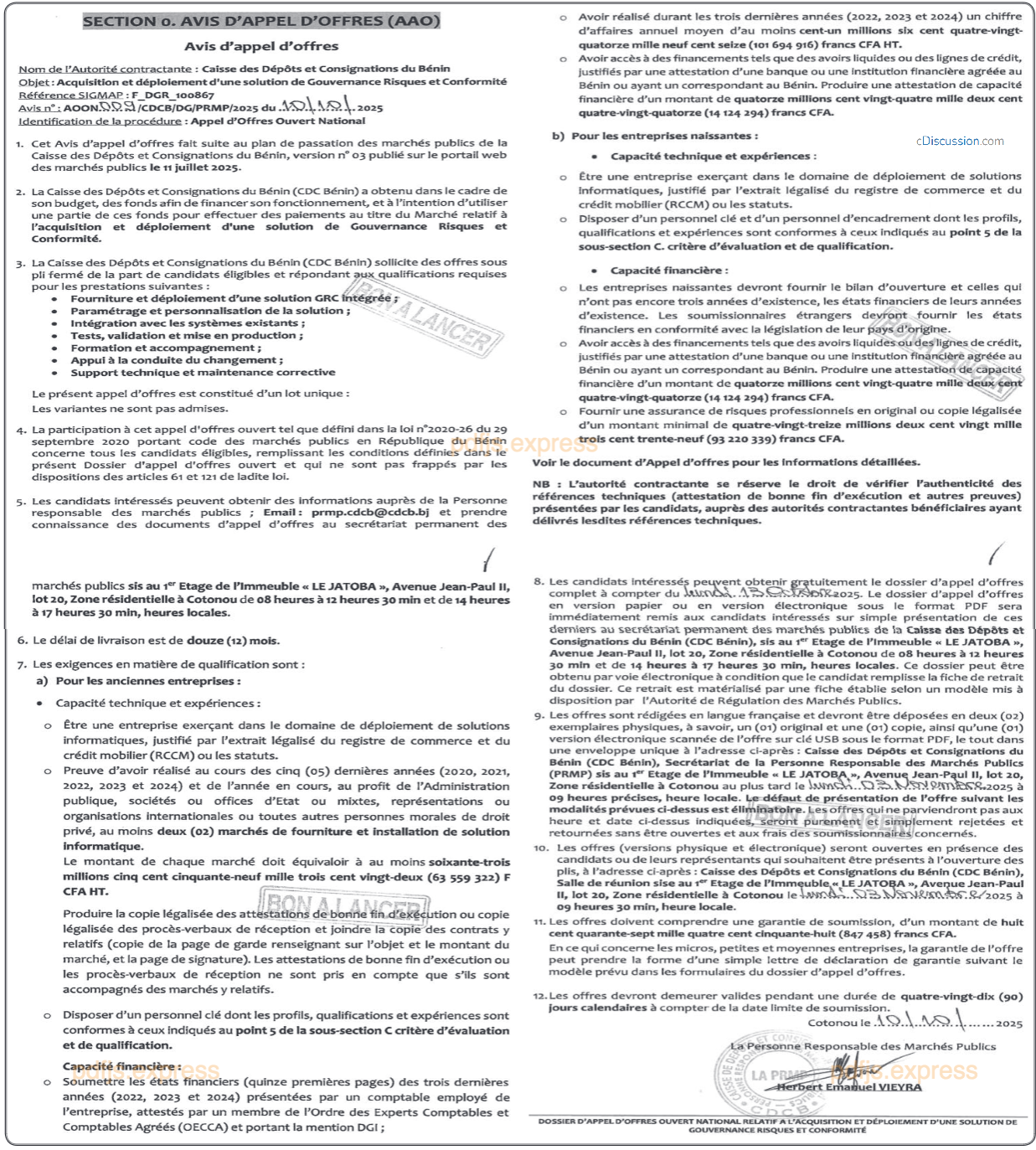 Avis d'appel d'offres relatif à l'acquisition et déploiement d'une solution de Gouvernance Risques et Conformité