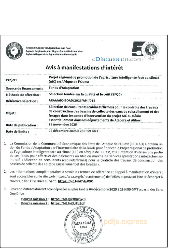 Sélection de consultants (cabinets/firmes) pour le contrôle des travaux de construction des bassins de collecte des eaux de ruissellement et des forages dans les zones d'intervention du projet AIC au Bénin essentiellement dans les départements de Atacora et Alibori