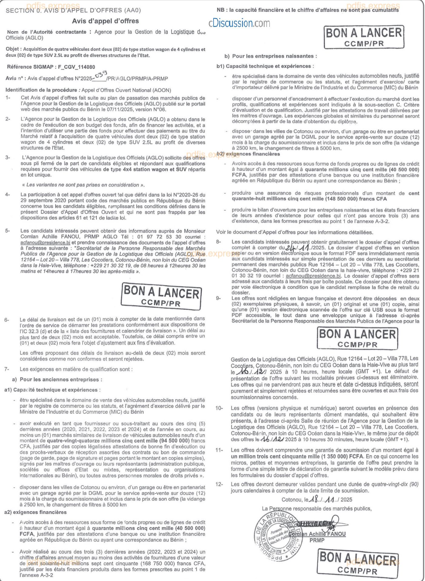 Acquisition de quatre (04) véhicules dont deux (02) de type station wagon de 4 cylindres et deux (02) de type SUV 2.5L au profit de diverses structures de l'Etat