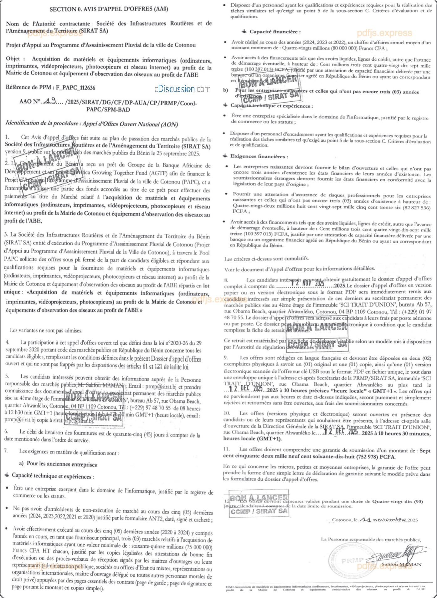 Acquisition de matériels et équipements informatiques (ordinateurs, imprimantes, vidéoprojecteurs et réseau internet) au profit de la Mairie de Cotonou et Equipement d'observation des oiseaux au profit de l'ABE