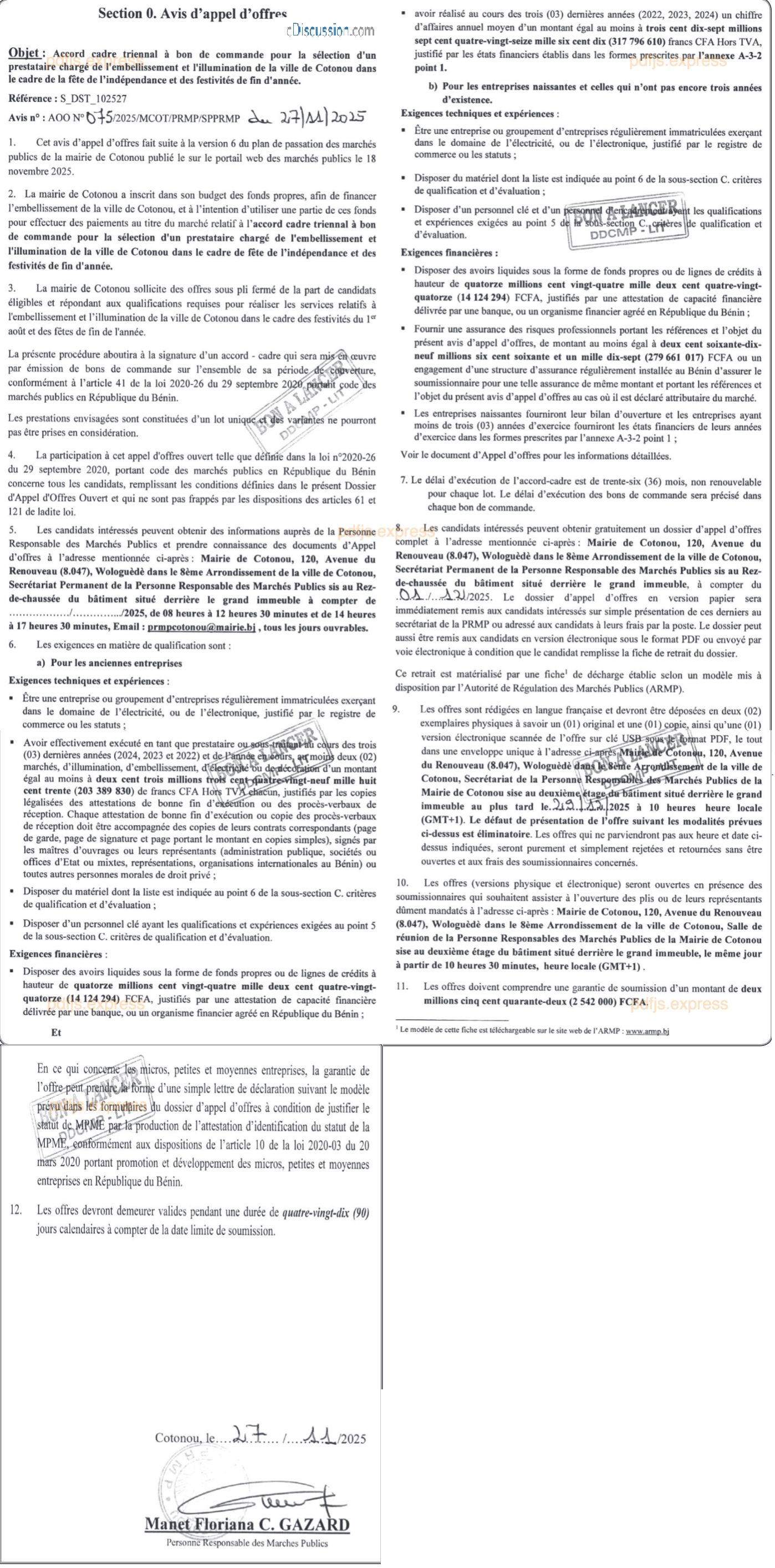 Accord cadre triennal à bon de commande pour la sélection d'un prestataire chargé de l'embellissement et l'illumination de la ville de Cotonou dans le cadre de la fête de l'indépendance et des festivités de fin d'année.