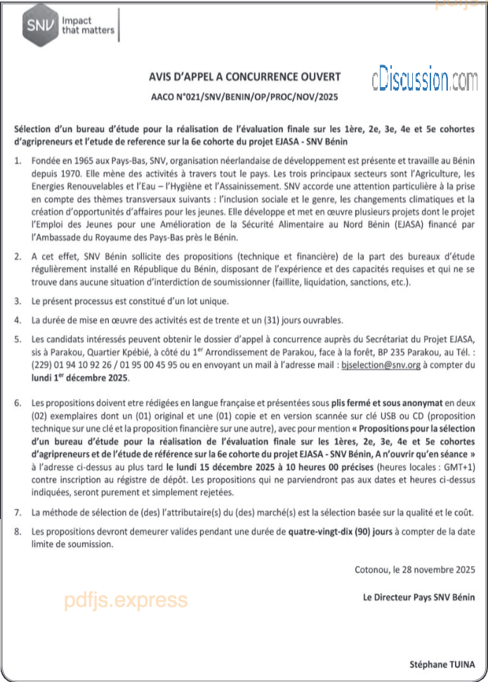 Avis d'Appel à concurrence ouvert relatif à la sélection d'un bureau d'étude pour la réalisation de l'évaluation finale sur les 1ère, 2è, 3è, 4è et 5è cohortes d'agripreneurs et l'étude de référence sur la 6è cohorte du projet EJASA-SNV BENIN