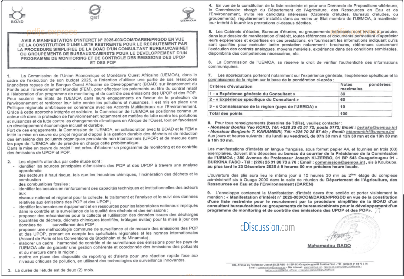 Avis à manifestation d'intérêt n°2025-003/COM/DAREN/PRGDD en vue de la constitution d'une liste restreinte pour le recrutement par la procédure simplifiée de la BOAD d'un consultant bureau/cabinet ou groupements de bureaux/cabinets pour le développement d'un programme de monitoring et de contrôle des émissions des UPOP et des POP
