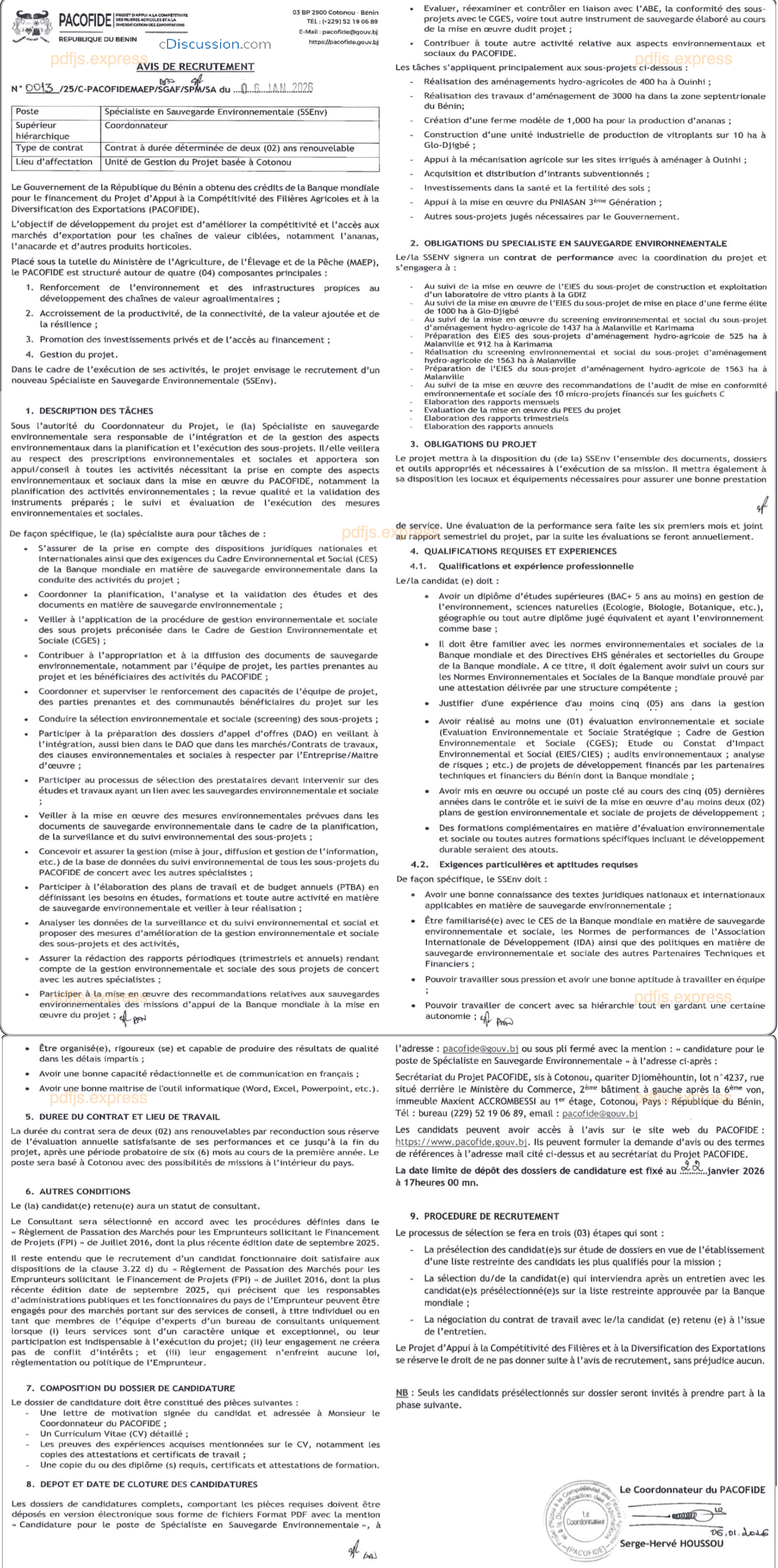 Avis de recrutement d'un Consultant en Sauvegarde Environnementale (SSEnv)