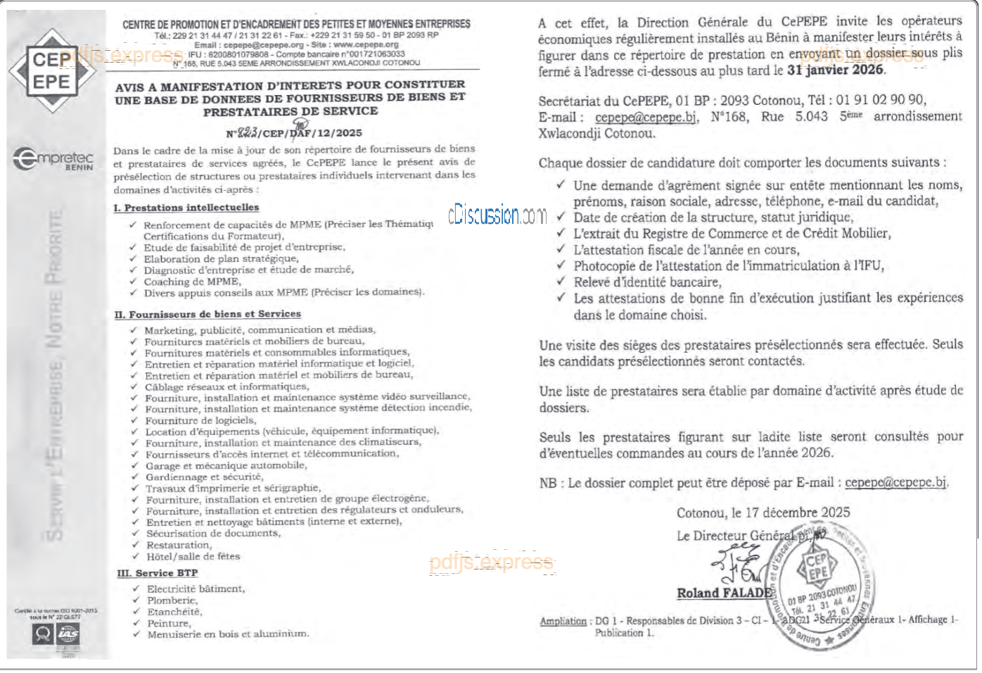 Avis à manifestation pour la Constitution d'une base de données de fournisseurs de biens et prestataires de services