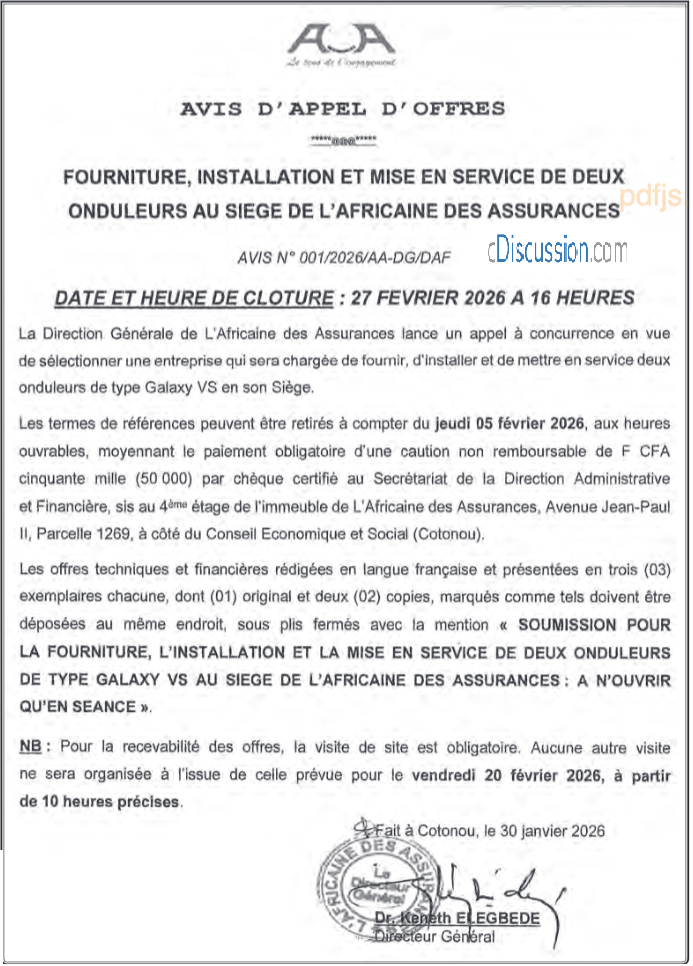 AVIS D'APPEL D'OFFRES RELATIF A LA FOURNITURE, L'INSTALLATION ET LA MISE EN SERVICE DE DEUX ONDULEURS AU SIEGE DE L'AFRICAINE DES ASSURANCES