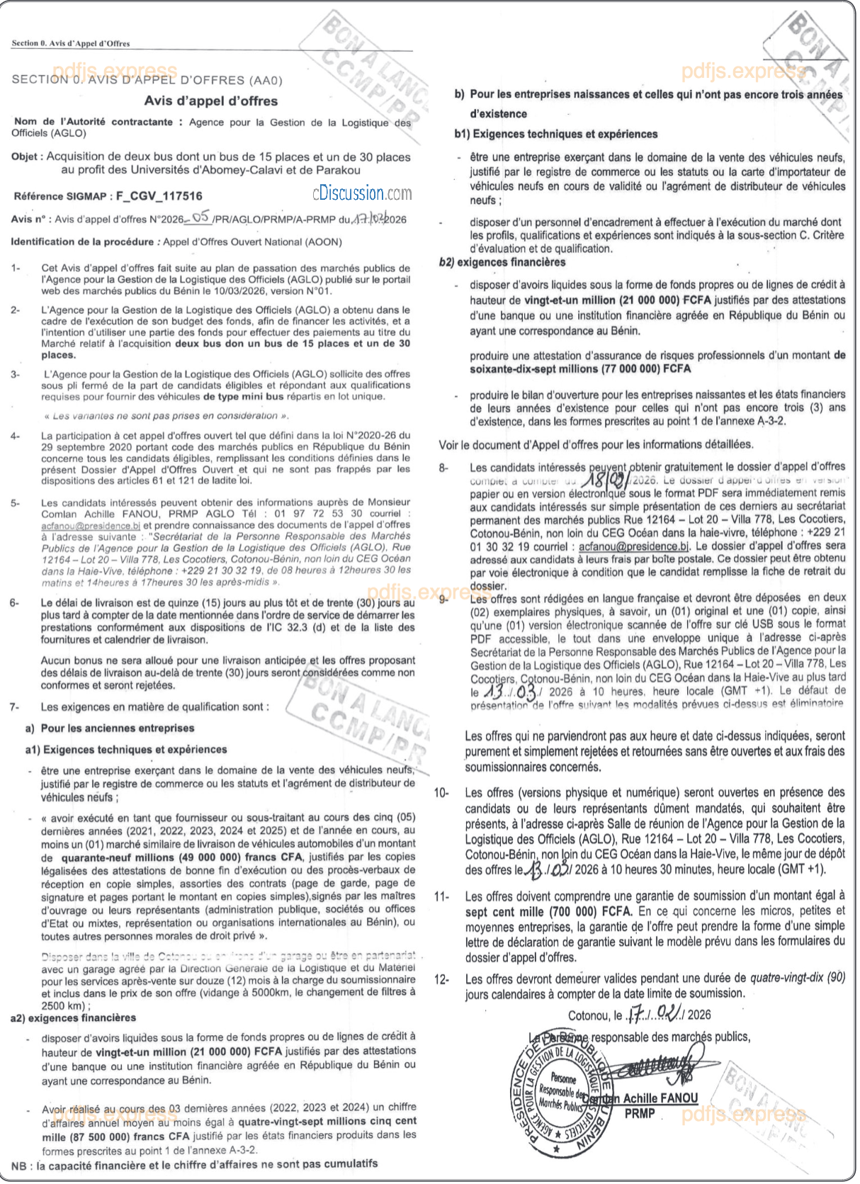 AVIS D'APPEL D'OFFRES RELATIF A L'ACQUISITION DE DEUX BUS DONT UN BUS DE QUINZE (15)PLACES ET UN BUS DE TRENTE (30) PLACES AU PROFIT DES UNIVERSITES D'ABOMEY-CALAVI ET DE PARAKOU