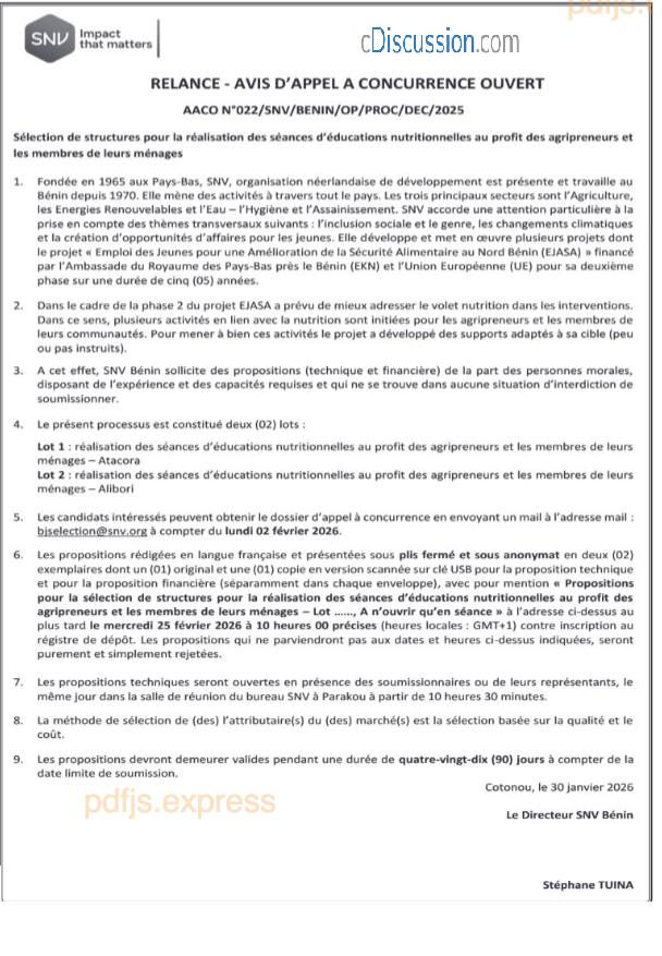 AVIS D'APPEL A CONCURRENCE OUVERT RELATIF A LA SELECTION DE STRUCTURES POUR LA REALISATION DES SEANCES D'EDUCATION NUTRITIONNELLES AU PROFIT DES AGRIPRENEURS ET LES MEMBRES DE LEURS MENAGES(RELANCE)