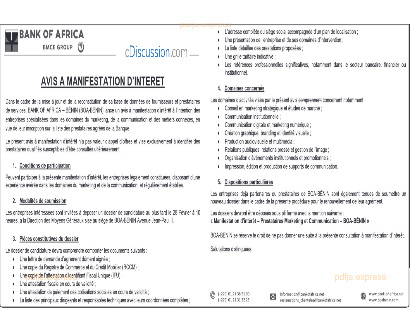 AVIS A MANIFESTATION D'INTERET RELATIF A LA MISE A JOUR ET LA RECONSTITUTION DE SA BASE DE DONNEES DE FOURNISSEURS ET PRESTATAIRES DE SERVICES
