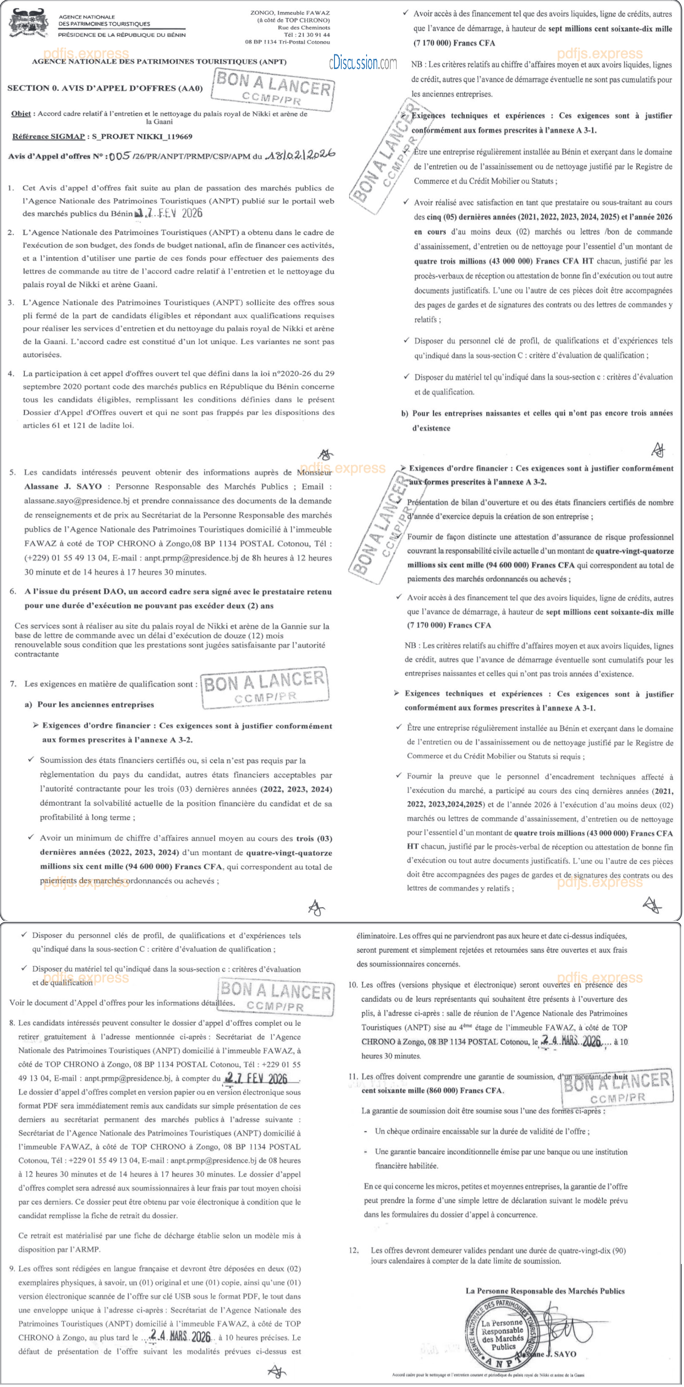 ACCORD CADRE RELATIF A L'ENTRETIEN ET LE NETTOYAGE DU PALAIS ROYAL DE NIKKI ET ARENE DE LA GAANI