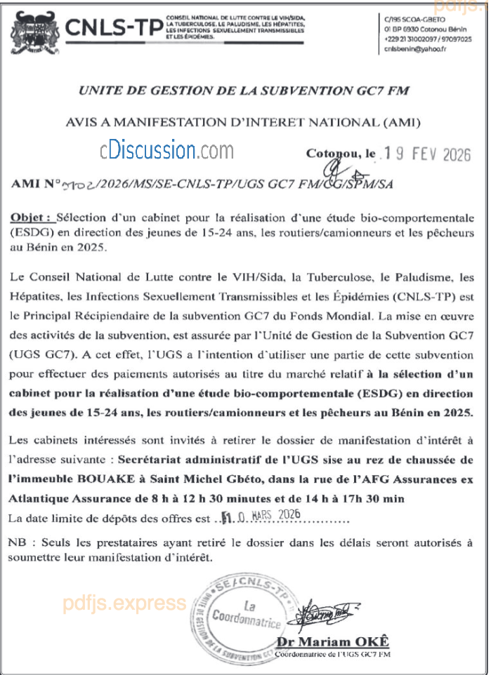 AVIS A MANIFESTATION D'INTERET NATIONAL RELATIF A LA SELECTION D'UN CABINET POUR LA D'UNE ETUDE BIO-COMPORTEMENTALE(ESDG) EN DIRECTION DES JEUNES DE 15-24 ANS, LES ROUTIERS / CAMIONNEURS ET LES PECHEURS AU BENIN EN 2025
