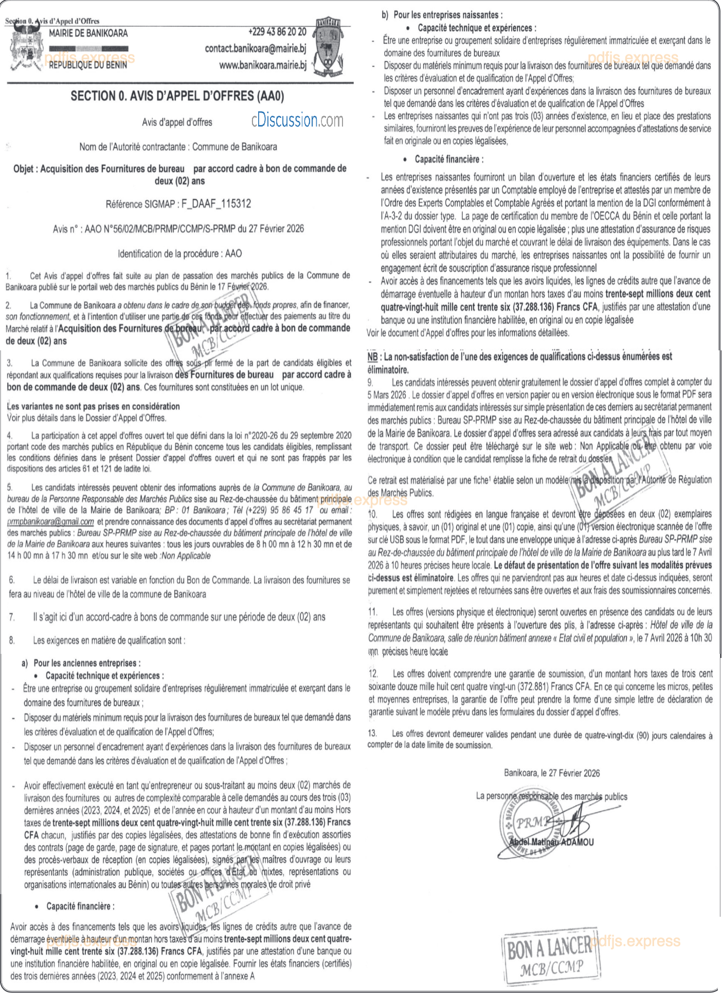 ACQUISITION DES FOURNIRURES DE BUREAU PAR ACCORD CADRE A BON DE COMMANDE DE DEUX(02) ANS