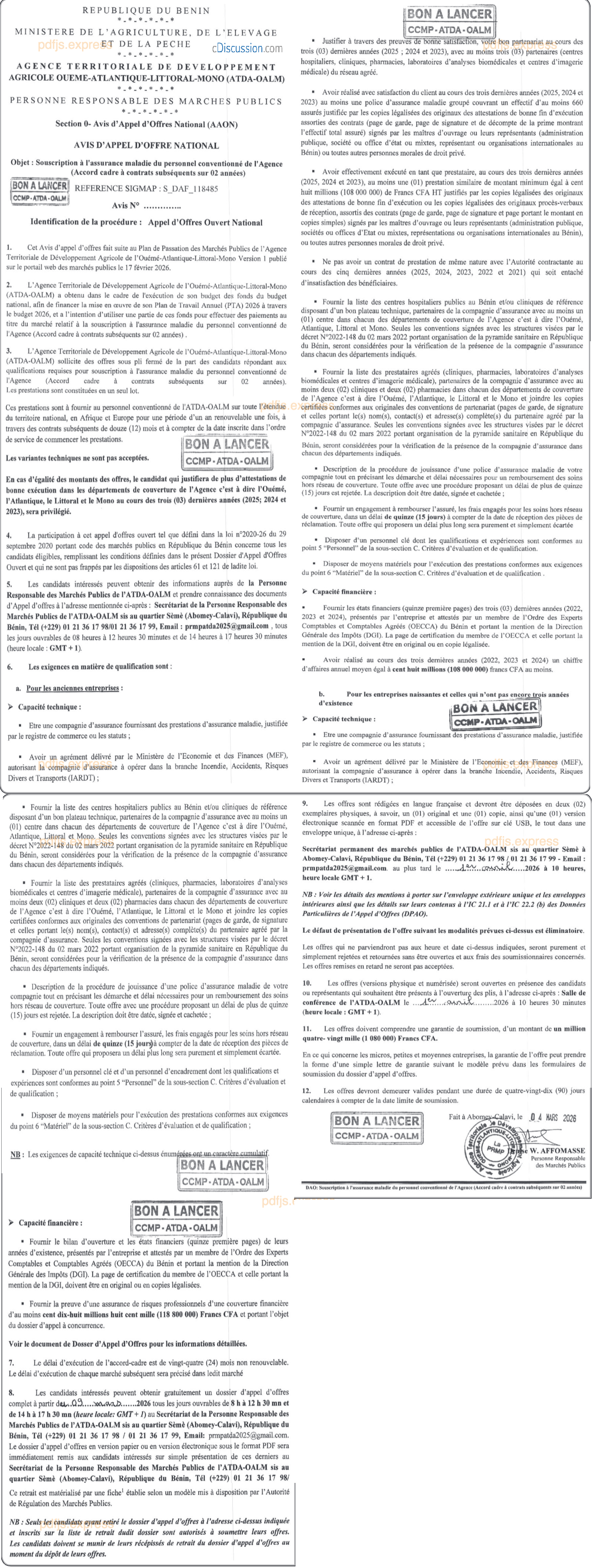 AVIS D'APPEL D'OFFRES NATIONAL: ACQUISITION A L'ASSURANCE MALADIE DU PERSONNEL CONVENTIONNE DE L'AGENCE(ACCORD CADRE A CONTRATS SUBSEQUENTS SUR 02 ANNEES)
