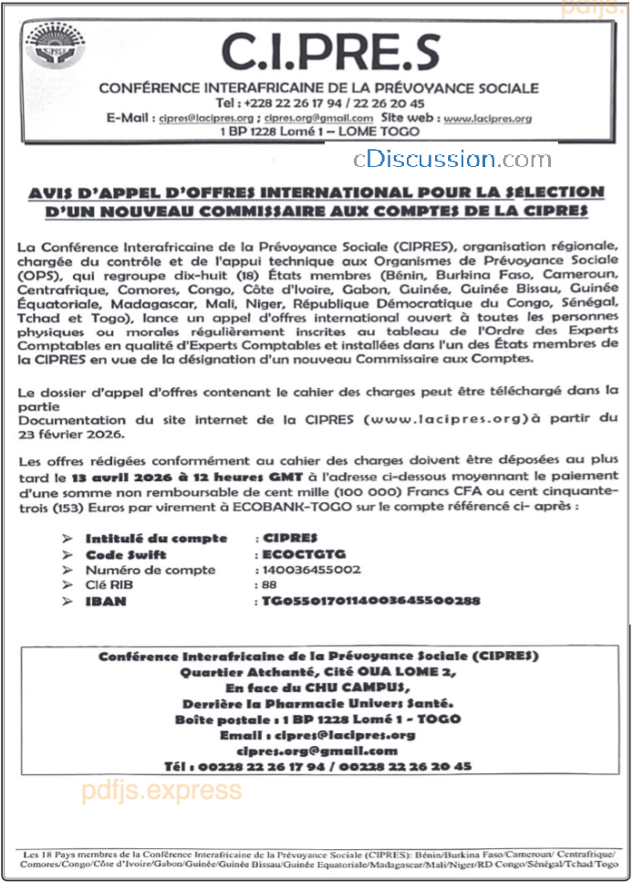 AVIS D'APPEL D'OFFRES INTERNATIONAL POUR LA SELECTION D'UN NOUVEAU COMMISSAIRE AUX COMPTES DE LA CIPRES