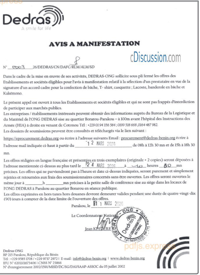 AVIS A MANIFESTATION RELATIF A LA SELECTION D'UN PRESTATAIRE EN VUE DE LA SIGNATURE D'UN ACCORD CADRE POUR LA CONFECTION DE BÂCHES, T-SHIRT, CASQUETTE, LACOSTE, BANDEROLE EN BACHE ET KAKEMONO