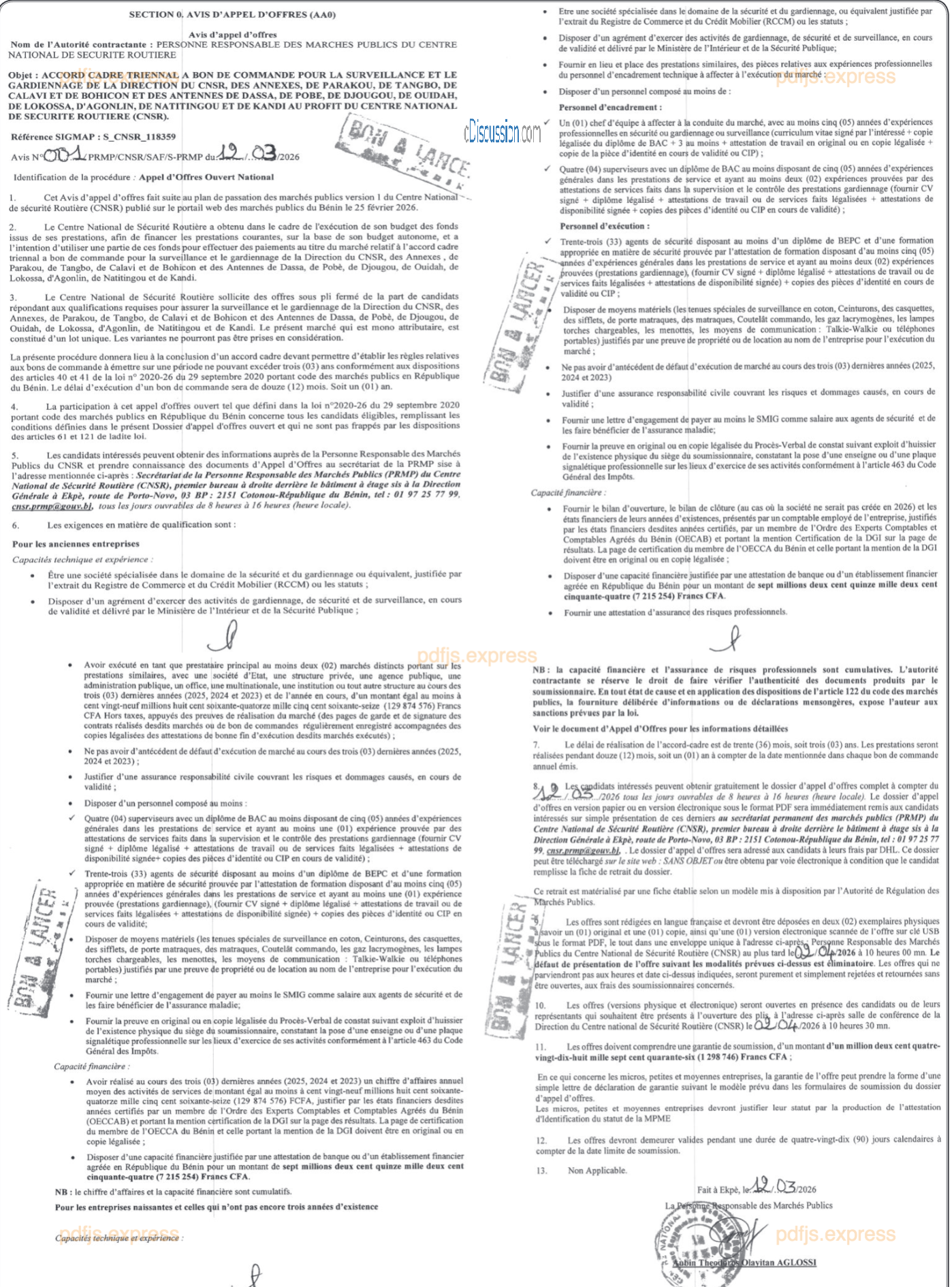ACCORD CADRE TRIENNAL A BON DE COMMANDE POUR LA SURVEILLANCE ET LE GARDIENNAGE DE LA DIRECTION DU CNSR, DES ANNEXES, DE PARAKOU, DE TANGBO, DE CALAVI ET DE BOHICON ET DES ANTENNES DE DASSA, DE POBE, DE DJOUGOU, DE OUIDAH, DE LOKOSSA, D'AGONLIN, DE NATITINGOU ET DE KANDI AU PROFIT DU CENTRE NATIONAL DE SECURITE ROUTIERE(CNSR)