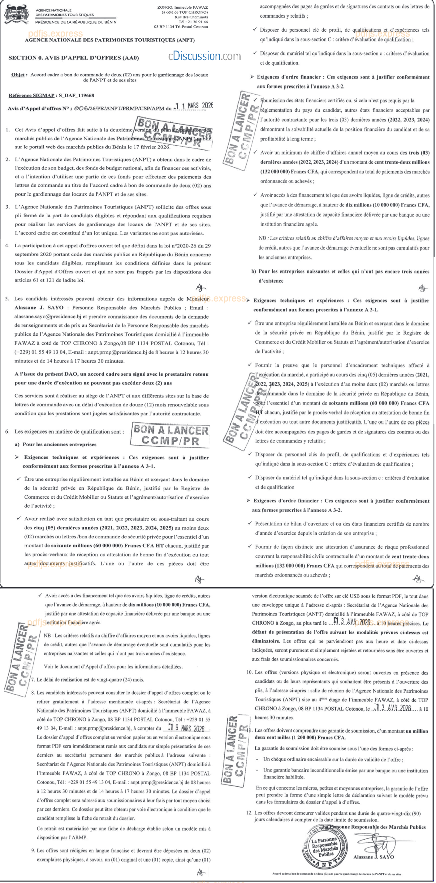 AVIS D'APPEL D'OFFRES: ACCORD CADRE A BON DE COMMANDE DE DEUX(02) ANS POUR LE GARDIENNAGE DES LOCAUX DE L'ANPT ET DE SES SITES