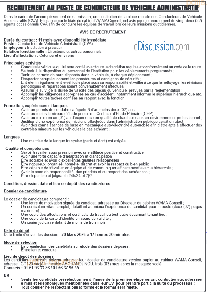RECRUTEMENT DES CONDUCTEURS DE VEHICULES ADMINISTRATIFS(CVA)